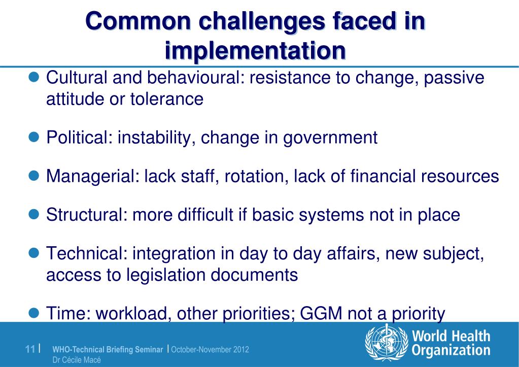 Common challenges faced in implementation • Cultural and behavioural: resistance to change, passive attitude or tolerance • Political: instability, change in government • Managerial: lack staff, rotation, lack of financial resources • Structural: more difficult if basic systems not in place • Technical: integration in day to day affairs, new subject, access to legislation documents • Time: workload, other priorities; GGM not a priority