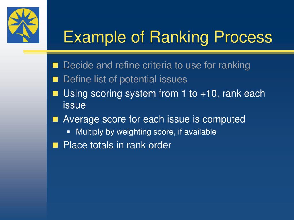 Example of Ranking Process • Decide and refine criteria to use for ranking • Define list of potential issues • Using scoring system from 1 to +10, rank each issue • Average score for each issue is computed • Multiply by weighting score, if available • Place totals in rank order