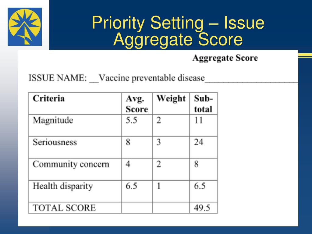 Additional Possible Criteria • Degree of control of PH system • Issue affects disproportionately minorities or disadvantaged groups (“disparity”) • What are the consequences of not intervening? • What are the potential negative impacts of addressing the problem?