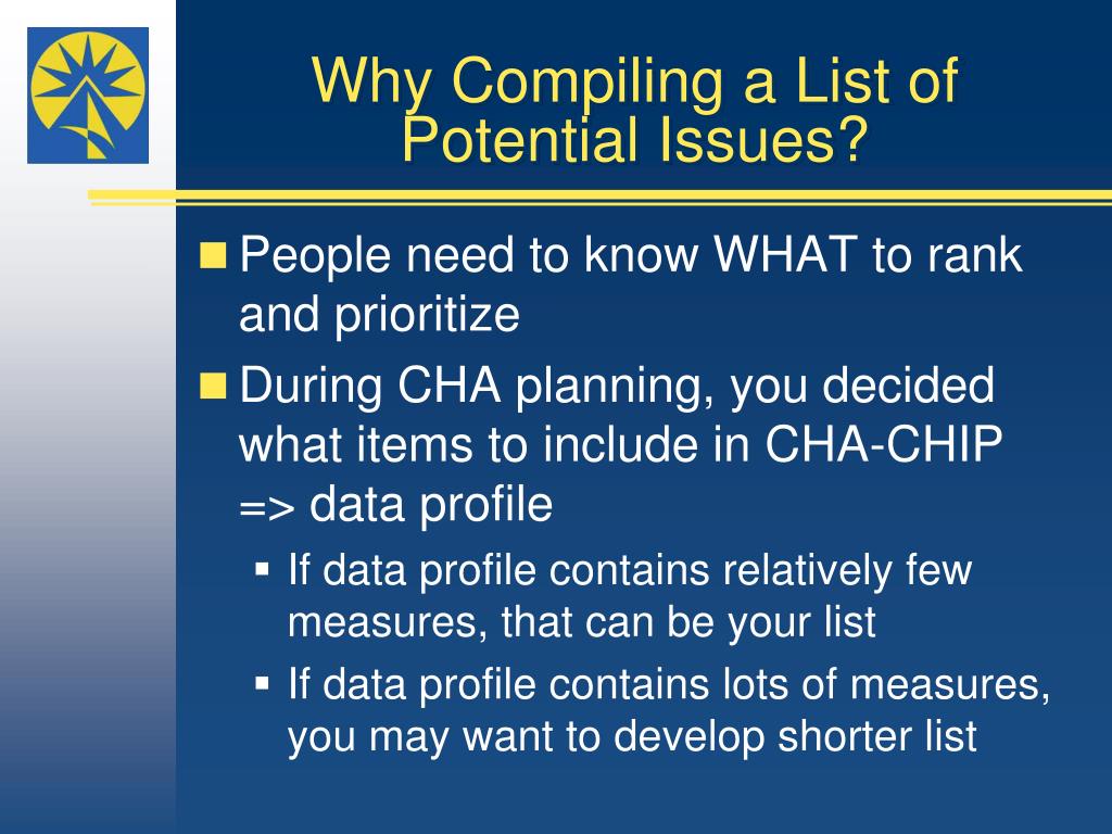 Why Compiling a List of Potential Issues? • People need to know WHAT to rank and prioritize • During CHA planning, you decided what items to include in CHA-CHIP => data profile • If data profile contains relatively few measures, that can be your list • If data profile contains lots of measures, you may want to develop shorter list
