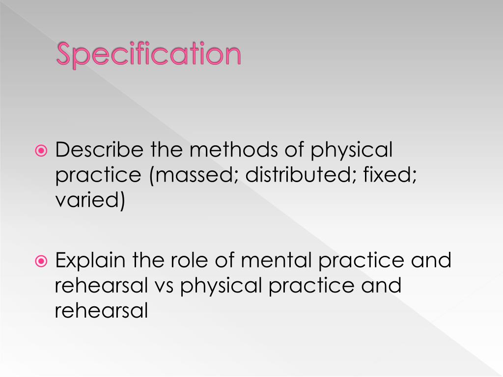 Specification • Describe the methods of physical practice (massed; distributed; fixed; varied) • Explain the role of mental practice and rehearsal vs physical practice and rehearsal