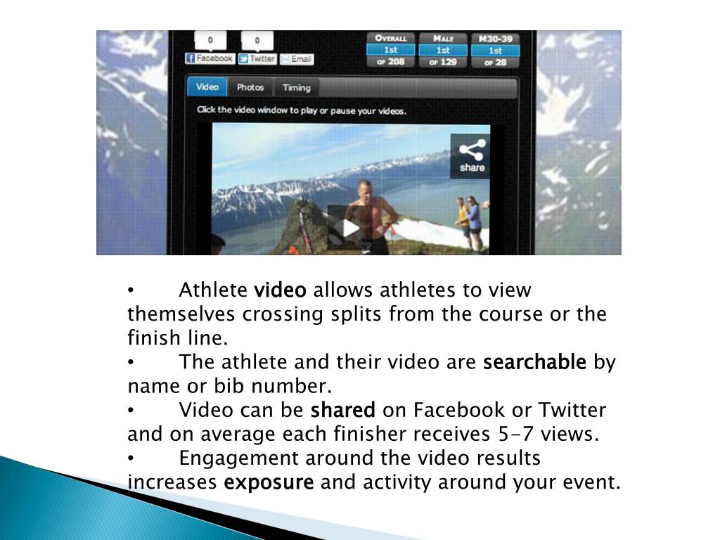 Athlete video allows athletes to view themselves crossing splits from the course or the finish line. • The athlete and their video are searchable by name or bib number. • Video can be shared on Facebook or Twitter and on average each finisher receives 5-7 views. • Engagement around the video results increases exposure and activity around your event.