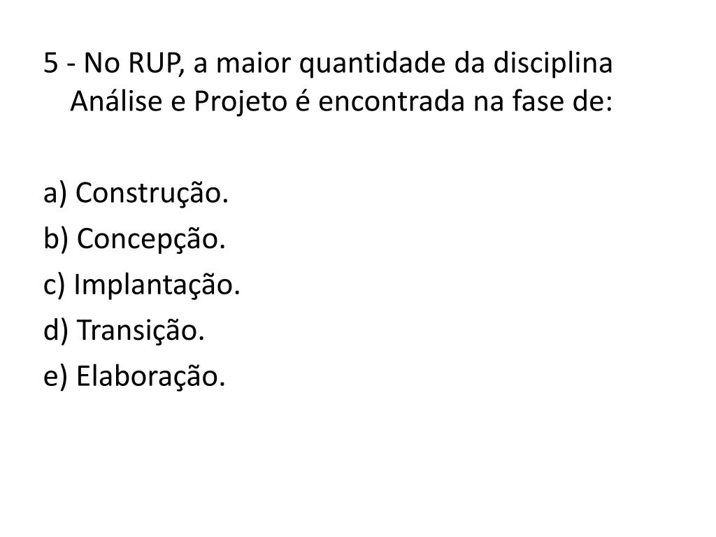 5 - No RUP, a maior quantidade da disciplina Análise e Projeto é encontrada na fase de: a) Construção. b) Concepção. c) Implantação. d) Transição. e) Elaboração.