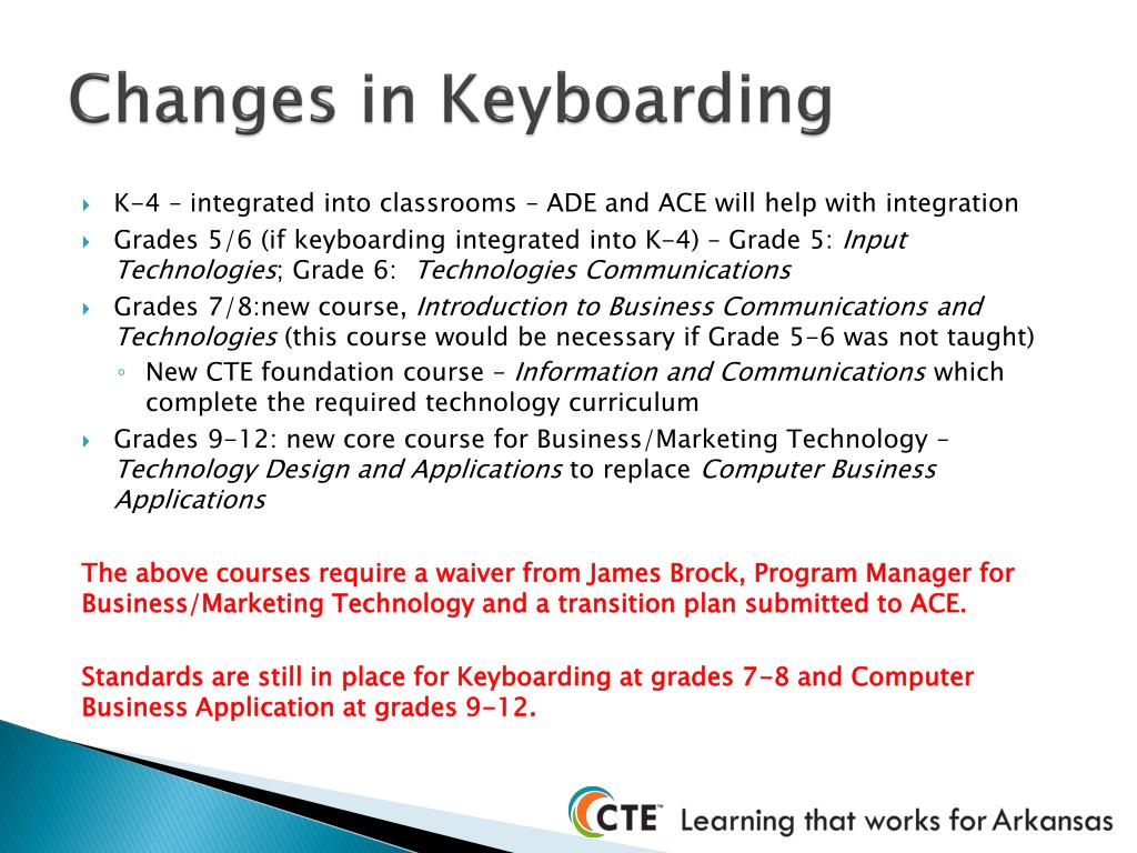 Changes in Keyboarding • K-4 – integrated into classrooms – ADE and ACE will help with integration • Grades 5/6 (if keyboarding integrated into K-4) – Grade 5: Input Technologies; Grade 6: Technologies Communications • Grades 7/8:new course, Introduction to Business Communications and Technologies (this course would be necessary if Grade 5-6 was not taught) • New CTE foundation course – Information and Communications which complete the required technology curriculum • Grades 9-12: new core course for Business/Marketing Technology – Technology Design and Applications to replace Computer Business Applications The above courses require a waiver from James Brock, Program Manager for Business/Marketing Technology and a transition plan submitted to ACE. Standards are still in place for Keyboarding at grades 7-8 and Computer Business Application at grades 9-12.