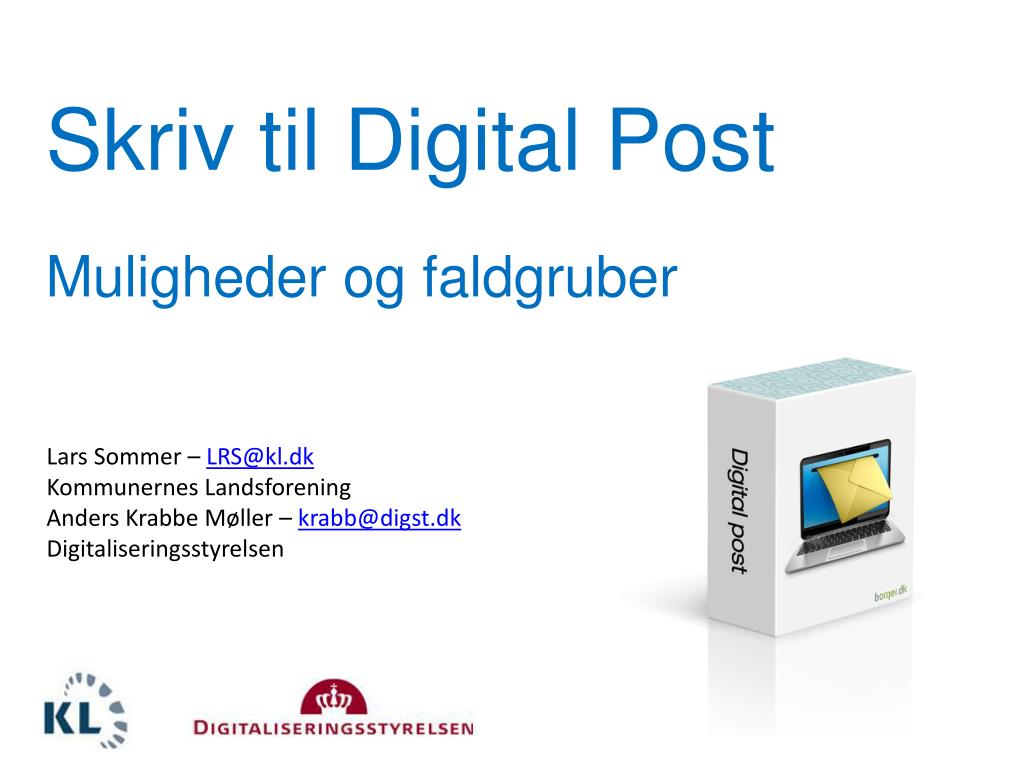 Skriv til Digital Post Muligheder og faldgruber Lars Sommer – LRS@kl.dk Kommunernes Landsforening Anders Krabbe Møller – krabb@digst.dk Digitaliseringsstyrelsen