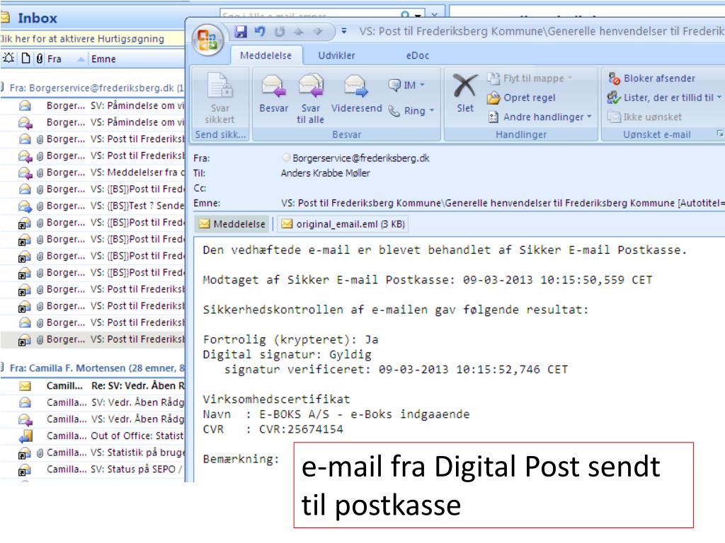 Løsning • Uddan brugerne. Fokus på de medarbejdere der fordeler post til andre brugere: • De skal kunne genkende en meddelelse fra Digital Post og kunne vedlægge en vejledning. • Hvis simpelt retursvar fra Outlook anvendes er det vigtigt at oplyse medarbejderne om hvordan et retursvar opmærkes korrekt.