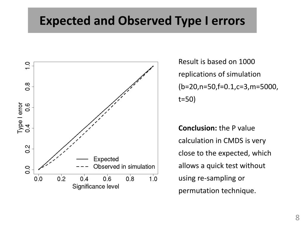 Expected and Observed Type I errors Result is based on 1000 replications of simulation (b=20,n=50,f=0.1,c=3,m=5000,t=50) Conclusion: the P value calculation in CMDS is very close to the expected, which allows a quick test without using re-sampling or permutation technique.