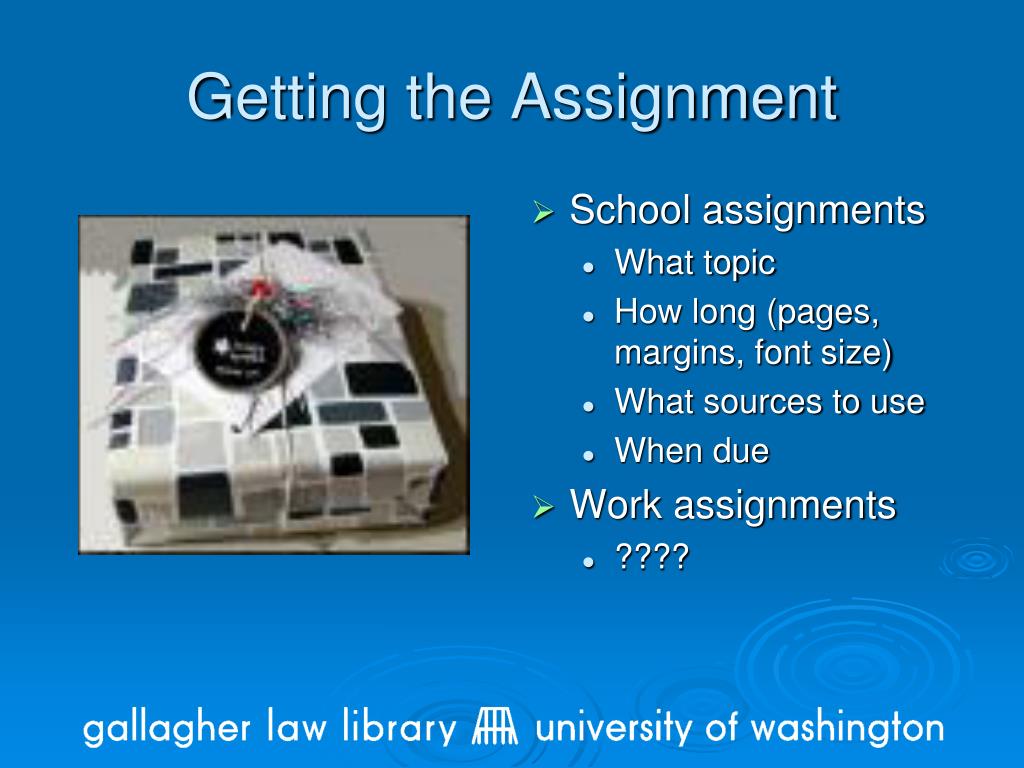 Getting the Assignment • School assignments • What topic • How long (pages, margins, font size) • What sources to use • When due • Work assignments • ????