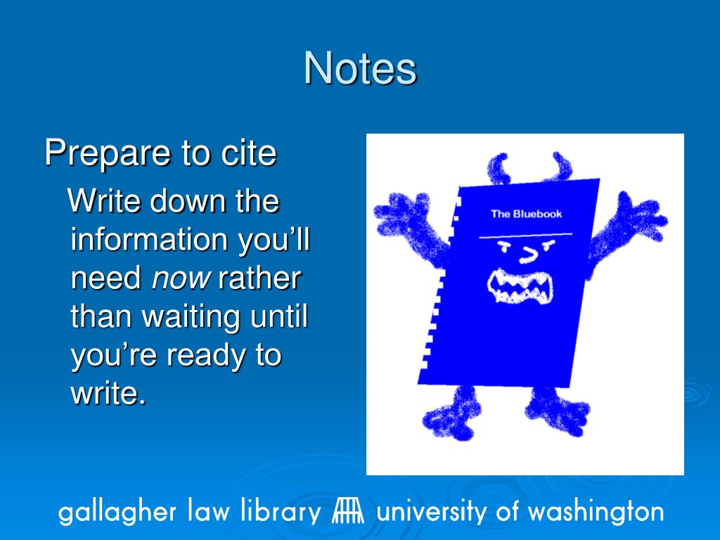 Notes Prepare to cite Write down the information you’ll need now rather than waiting until you’re ready to write.