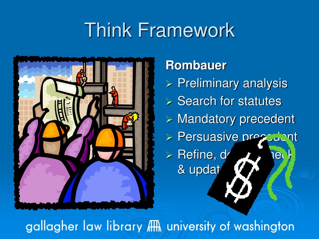 Rombauer Preliminary analysis Search for statutes Mandatory precedent Persuasive precedent Refine, double-check & update Think Framework