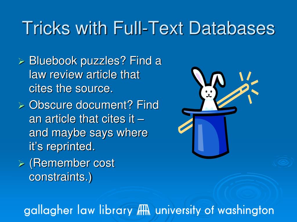 Tricks with Full-Text Databases • Bluebook puzzles? Find a law review article that cites the source. • Obscure document? Find an article that cites it – and maybe says where it’s reprinted. • (Remember cost constraints.)