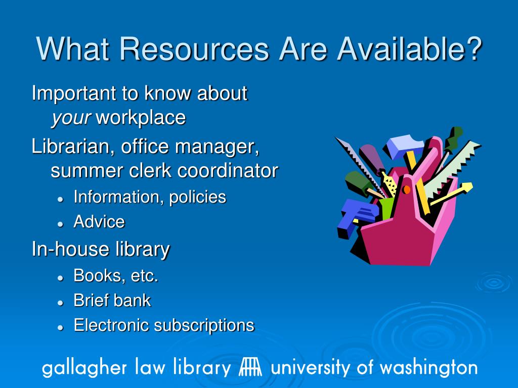 What Resources Are Available? Important to know about yourworkplace Librarian, office manager, summer clerk coordinator • Information, policies • Advice In-house library • Books, etc. • Brief bank • Electronic subscriptions