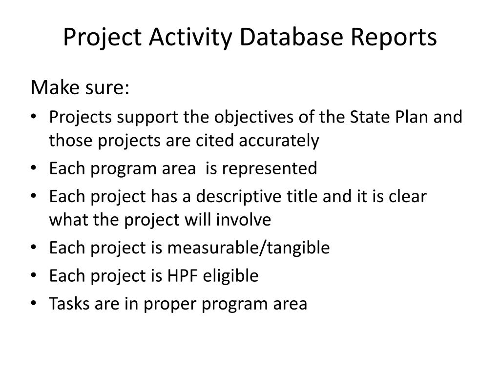 Project Activity Database Reports Make sure: • Projects support the objectives of the State Plan and those projects are cited accurately • Each program area is represented • Each project has a descriptive title and it is clear what the project will involve • Each project is measurable/tangible • Each project is HPF eligible • Tasks are in proper program area
