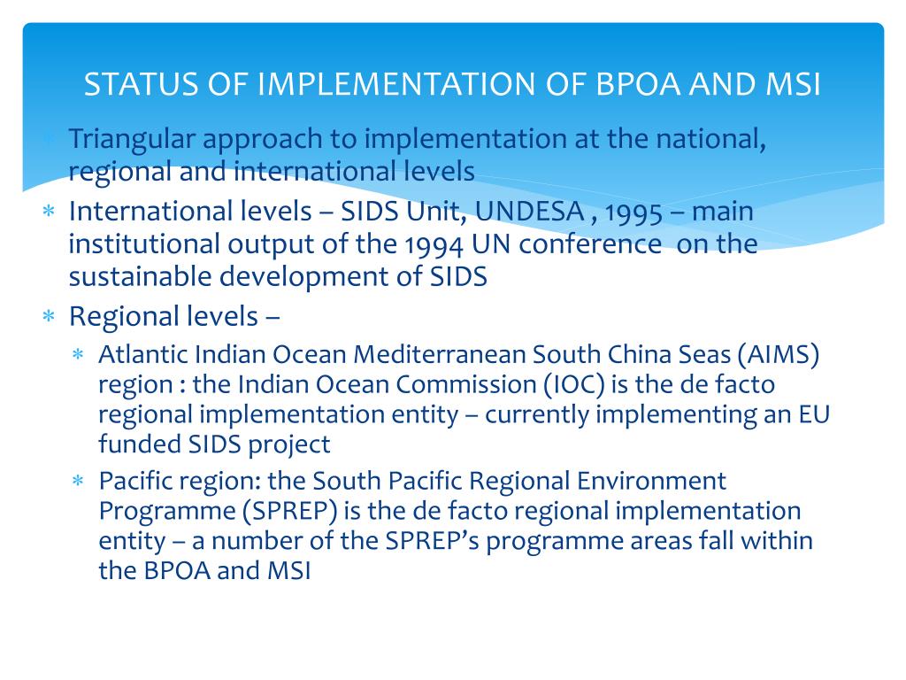 STATUS OF IMPLEMENTATION OF BPOA AND MSI • Triangular approach to implementation at the national, regional and international levels • International levels – SIDS Unit, UNDESA , 1995– main institutional output of the 1994 UN conference on the sustainable development of SIDS • Regional levels – • Atlantic Indian Ocean Mediterranean South China Seas (AIMS) region : the Indian Ocean Commission (IOC) is the de facto regional implementation entity – currently implementing an EU funded SIDS project • Pacific region: the South Pacific Regional Environment Programme (SPREP) is the de facto regional implementation entity – a number of the SPREP’s programme areas fall within the BPOA and MSI