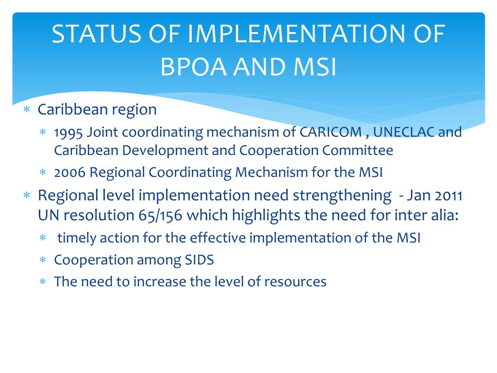STATUS OF IMPLEMENTATION OF BPOA AND MSI • Caribbean region • 1995 Joint coordinating mechanism of CARICOM ,UNECLAC and Caribbean Development and Cooperation Committee • 2006 Regional Coordinating Mechanism for the MSI • Regional level implementation need strengthening - Jan 2011 UN resolution 65/156 which highlights the need for inter alia: • timely action for the effective implementation of the MSI • Cooperation among SIDS • The need to increase the level of resources