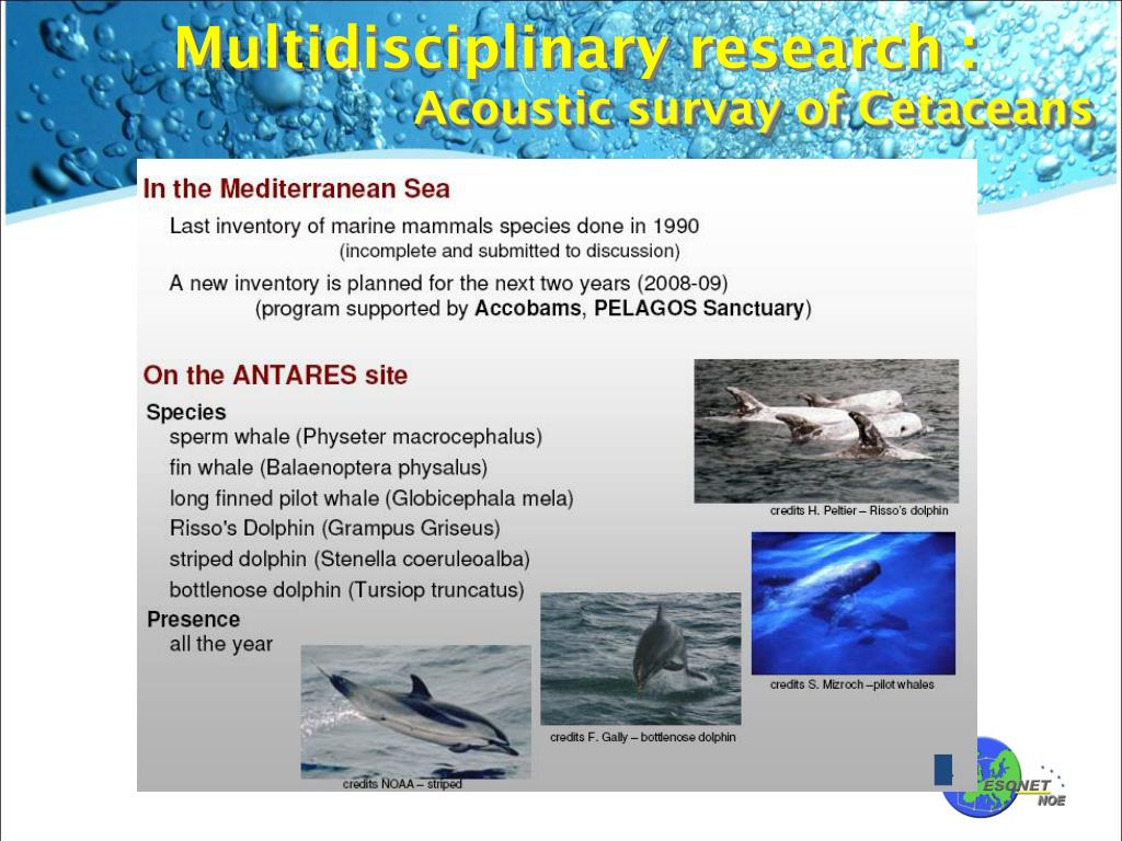 ANTARES NODE : MULTIDISCIPLINARY SCIENCE • PPF ANTARES - Bioluminescence (2002 – 2004) (PIs: I. Dekeyser, E. Aslanides, C. Tamburini) • ANTARESOceanologie (2006) (Pis: L. Laubier puis I. Dekeyser) • videosurveillance camera - MicroCAT CTD HP culture apparatus for bioluminescence • Post-doc (6 mois): AS Cussat-Legras (2006-2007) • ANR POTES program (2006 – 2009) (PI: C. Tamburini) • IODA6000 development ; Optote sensor (Aanderaa) IL07 • Bioluminescence by bacteria - Hydrocarbon degradation in deep-sea environments • CIESM • Hydro-Changes Program PI: JL Fuda, G. Rougier C. Millot puis P. Raimbault T,S, currents (Mediterranean scale) • APO program funded by CNRS - PACA (2007) (PI: D. Lefèvre) • Optote sensors (Aanderaa) for IODA6000 • OPERA cruises by CNRS – Lefe (2009) (PI: D. Lefèvre) • Calibration of ANTARES sensors & Biogeochemistry studies • AAMIS project by Universitée de la Méditerranée (2008 – 2009) PIs: C. Tamburini, S. Escoffier • Calibration of ANTARES sensors Biogeochemistry studies • EUROsites project – FP7 (2008 – 2010) Coordinator: R. Lampitt; PI: C. Tamburini • IODA6000 validation ; IODA6000 for other Eularian sites; Long-term series data valorisation • ESONET NoE FP6, WP1 & WP2