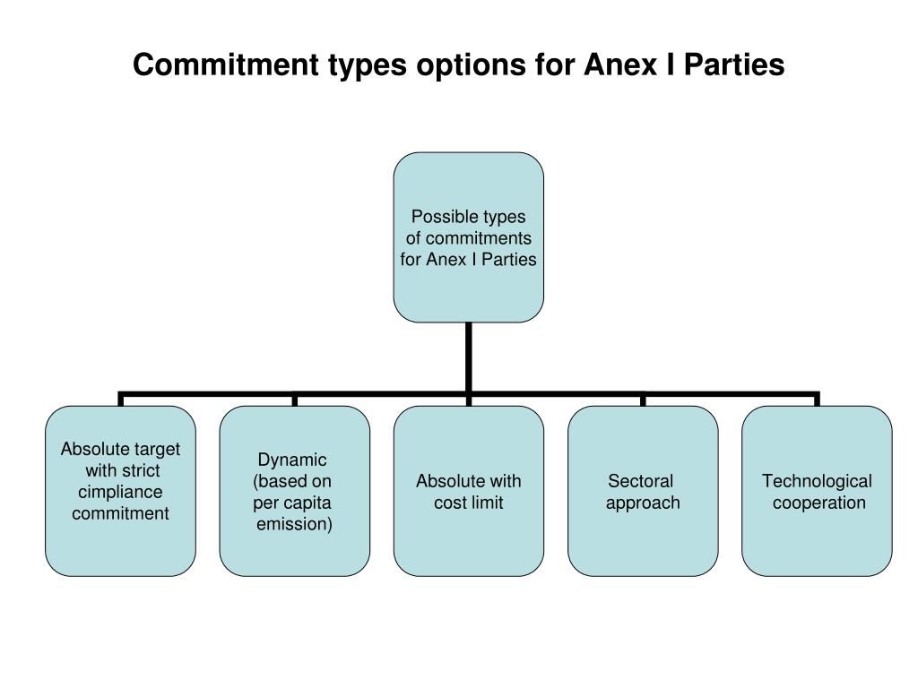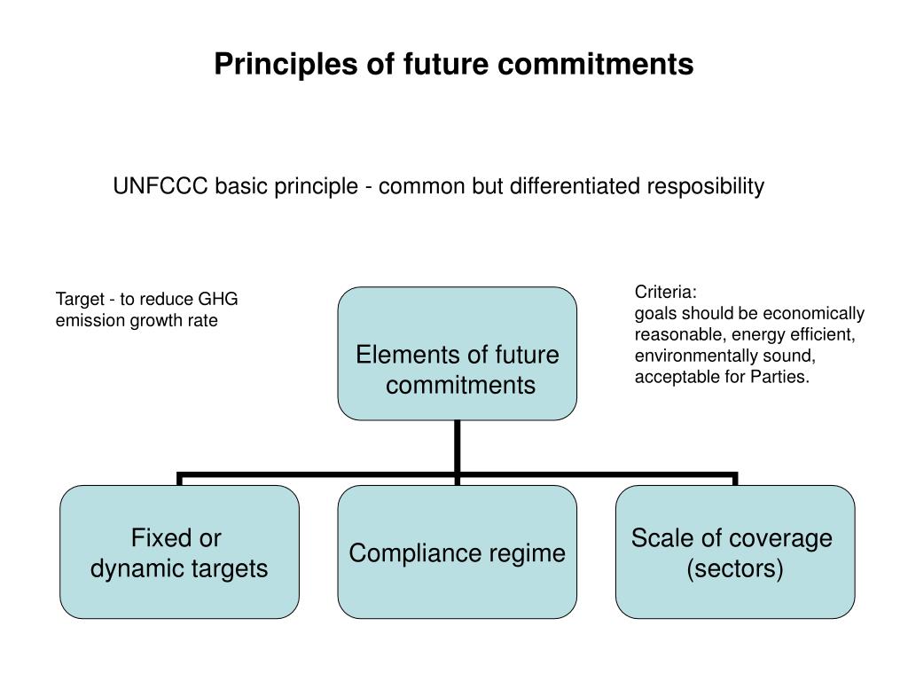 Principles of future commitments UNFCCC basic principle - common but differentiated resposibility Criteria: goals should be economically reasonable, energy efficient, environmentally sound, acceptable for Parties. Target - to reduce GHG emission growth rate