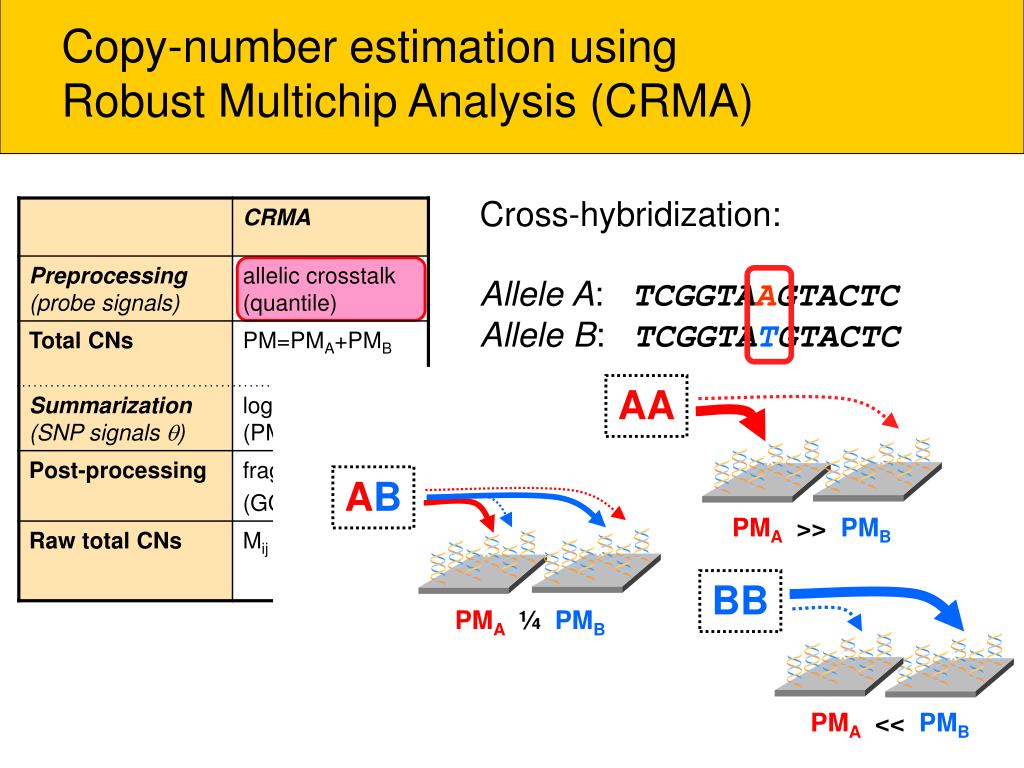 * * * * * * * * * * * * * * * * * * * AA BB AB PMA >> PMB PMA << PMB PMA ¼PMB Copy-number estimation using Robust Multichip Analysis (CRMA) Cross-hybridization: Allele A: TCGGTAAGTACTC Allele B: TCGGTATGTACTC