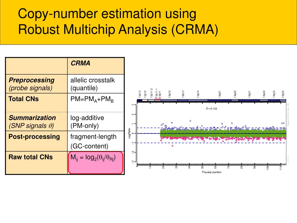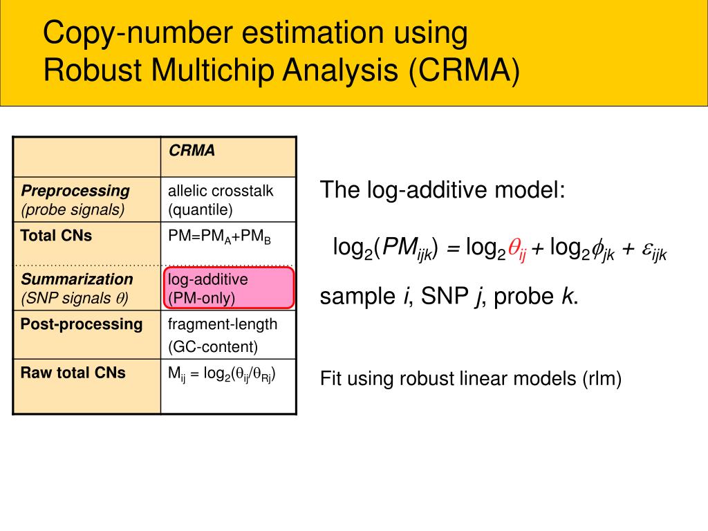 Copy-number estimation using Robust Multichip Analysis (CRMA) The log-additive model: log2(PMijk) = log2ij+ log2jk + ijk sample i, SNP j, probe k. Fit using robust linear models (rlm)