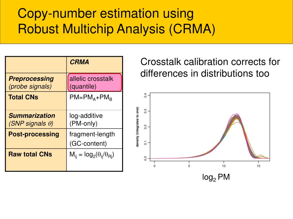 Copy-number estimation using Robust Multichip Analysis (CRMA) Crosstalk calibration corrects for differences in distributions too log2 PM
