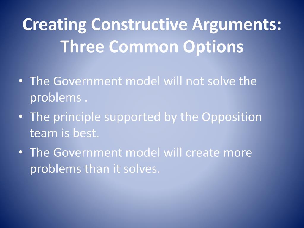 Creating Constructive Arguments: Three Common Options • The Government model will not solve the problems . • The principle supported by the Opposition team is best. • The Government model will create more problems than it solves.