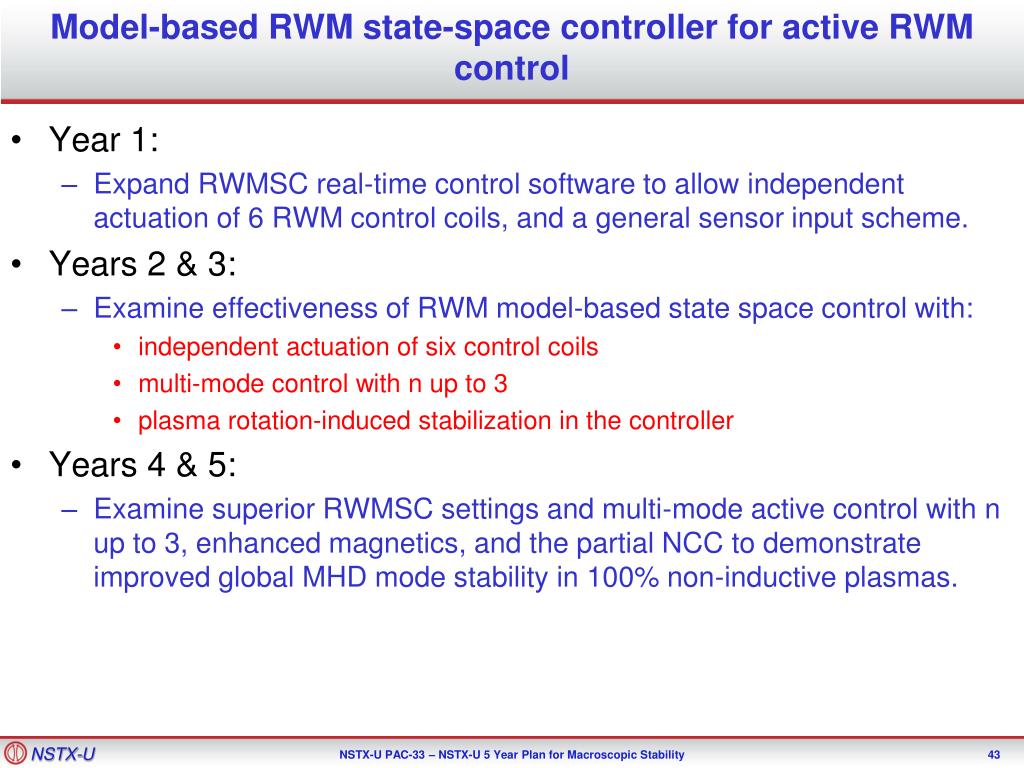 Model-based RWM state-space controller for active RWM control • Year 1: • Expand RWMSC real-time control software to allow independent actuation of 6 RWM control coils, and a general sensor input scheme. • Years 2 & 3: • Examine effectiveness of RWM model-based state space control with: • independent actuation of six control coils • multi-mode control with n up to 3 • plasma rotation-induced stabilization in the controller • Years 4 & 5: • Examine superior RWMSC settings and multi-mode active control with n up to 3, enhanced magnetics, and the partial NCC to demonstrate improved global MHD mode stability in 100% non-inductive plasmas.