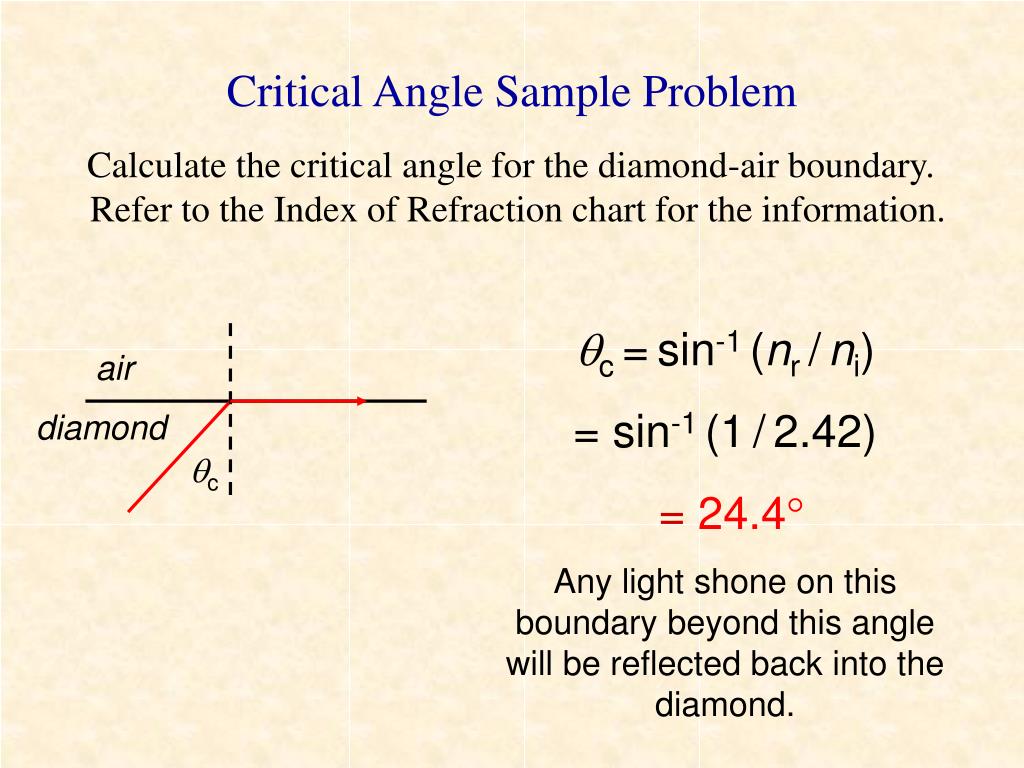Critical Angle Sample Problem Calculate the critical angle for the diamond-air boundary. Refer to the Index of Refraction chart for the information. c =sin-1(nr /ni) = sin-1(1/2.42) =24.4 Any light shone on this boundary beyond this angle will be reflected back into the diamond. air diamond c