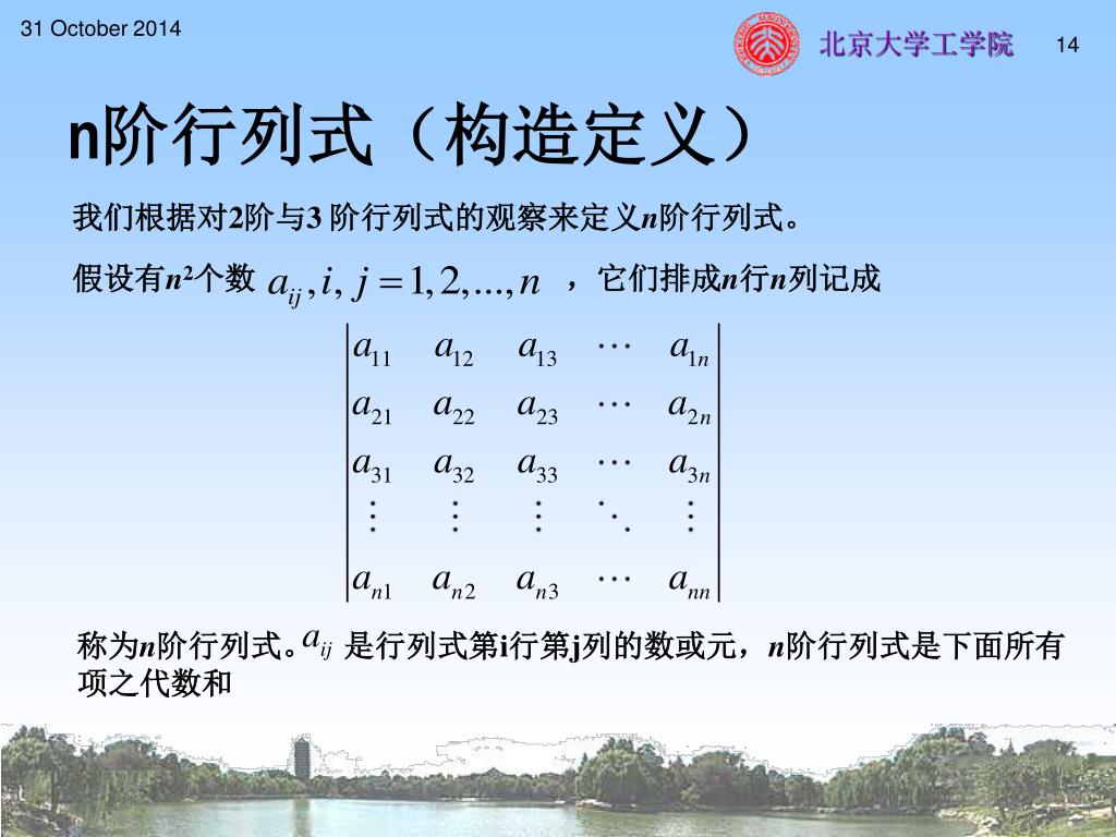 n阶行列式(构造定义) 我们根据对2阶与3 阶行列式的观察来定义n阶行列式。 假设有n2个数 ,它们排成n行n列记成 称为n阶行列式。 是行列式第i行第j列的数或元,n阶行列式是下面所有项之代数和