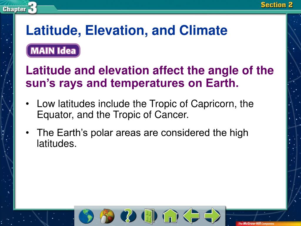 Latitude, Elevation, and Climate Latitude and elevation affect the angle of the sun’s rays and temperatures on Earth. • Low latitudes include the Tropic of Capricorn, the Equator, and the Tropic of Cancer. • The Earth’s polar areas are considered the high latitudes. Section 2
