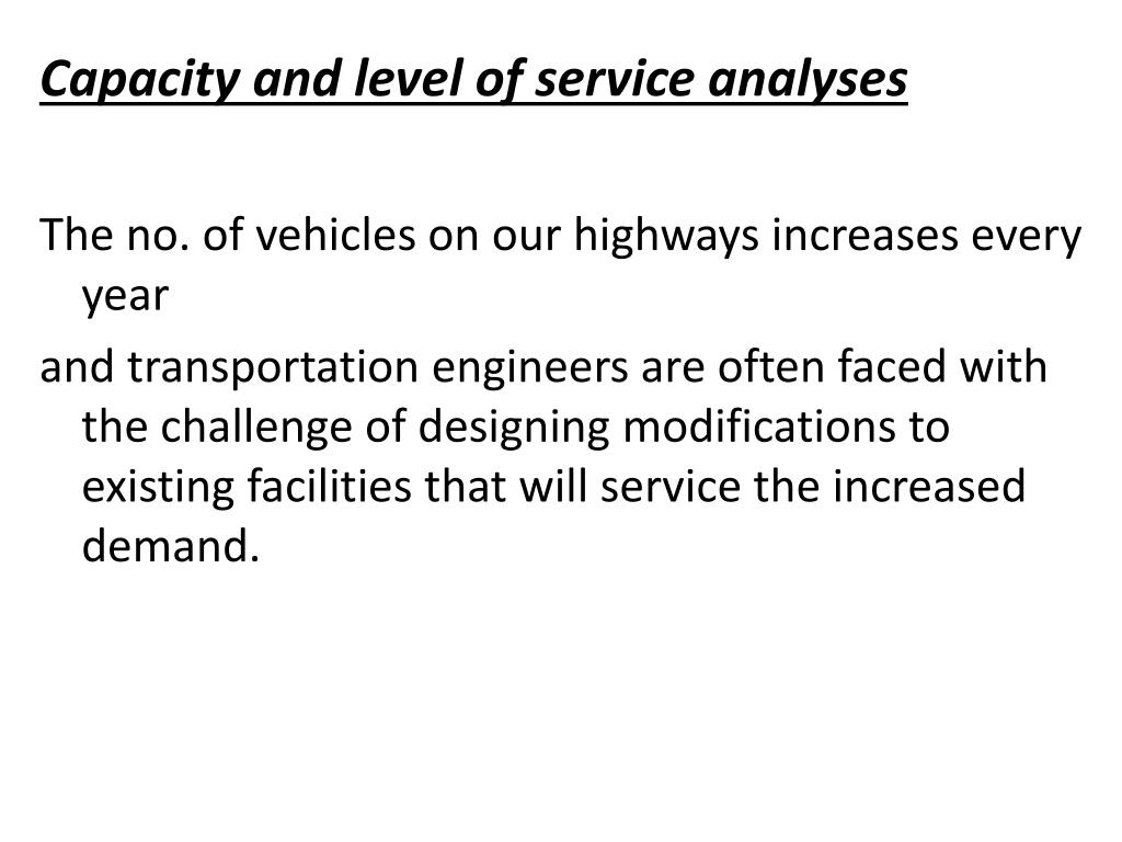 Capacity and level of service analyses The no. of vehicles on our highways increases every year and transportation engineers are often faced with the challenge of designing modifications to existing facilities that will service the increased demand.