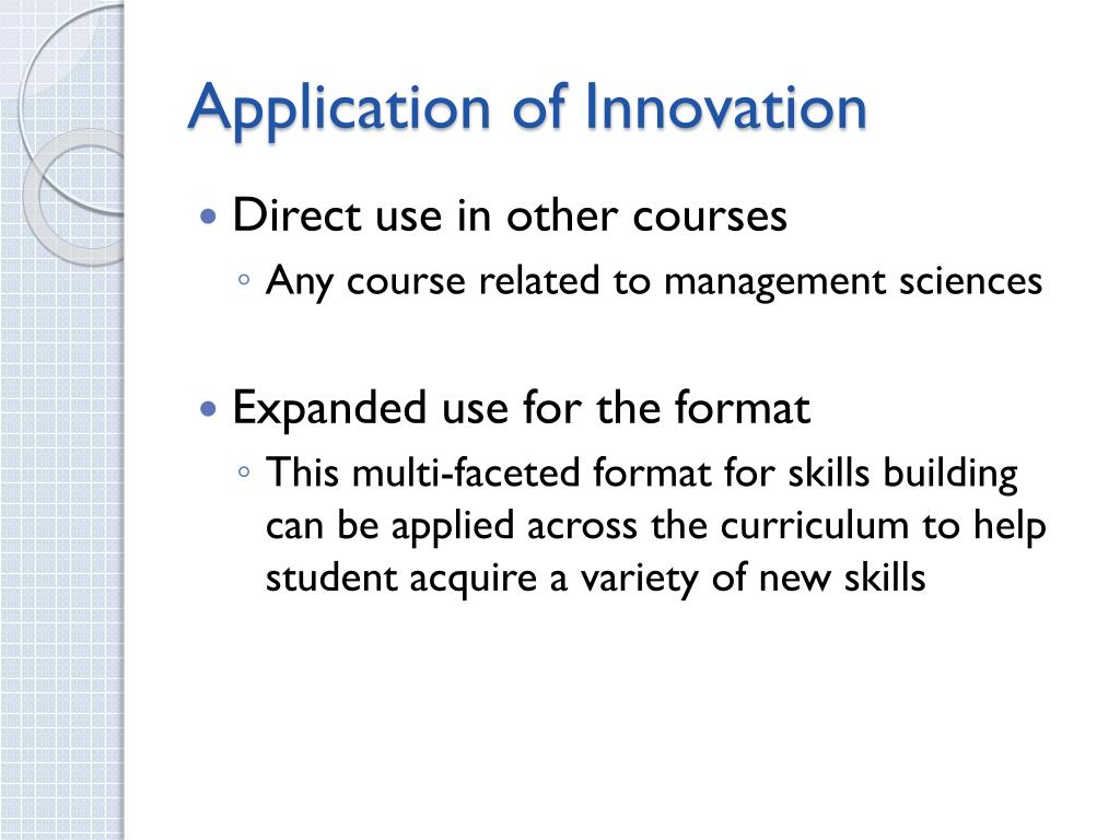 Application of Innovation • Direct use in other courses • Any course related to management sciences • Expanded use for the format • This multi-faceted format for skills building can be applied across the curriculum to help student acquire a variety of new skills