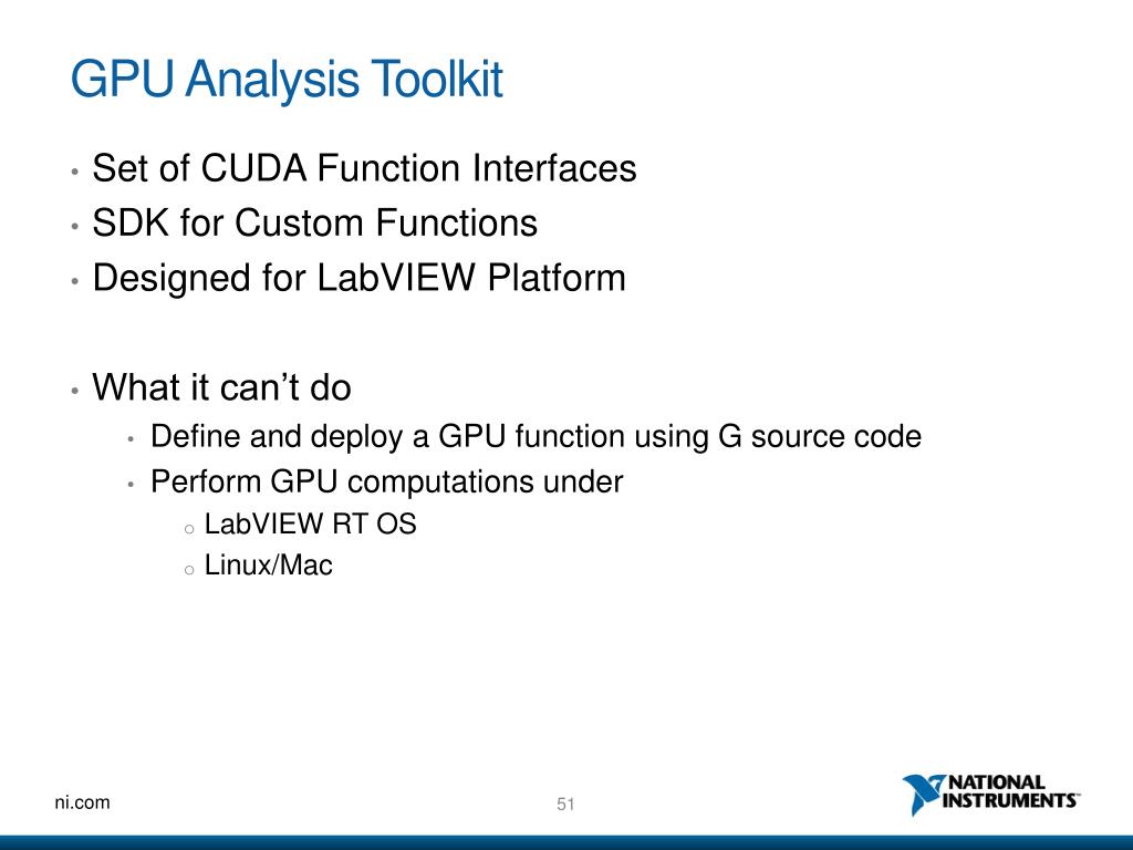 GPU Analysis Toolkit • Set of CUDA Function Interfaces • SDK for Custom Functions • Designed for LabVIEW Platform • What it can’t do • Define and deploy a GPU function using G source code • Perform GPU computations under • LabVIEW RT OS • Linux/Mac