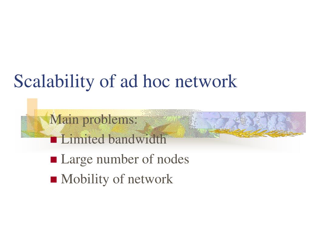 Scalability of ad hoc network Main problems: Limited bandwidth Large number of nodes Mobility of network