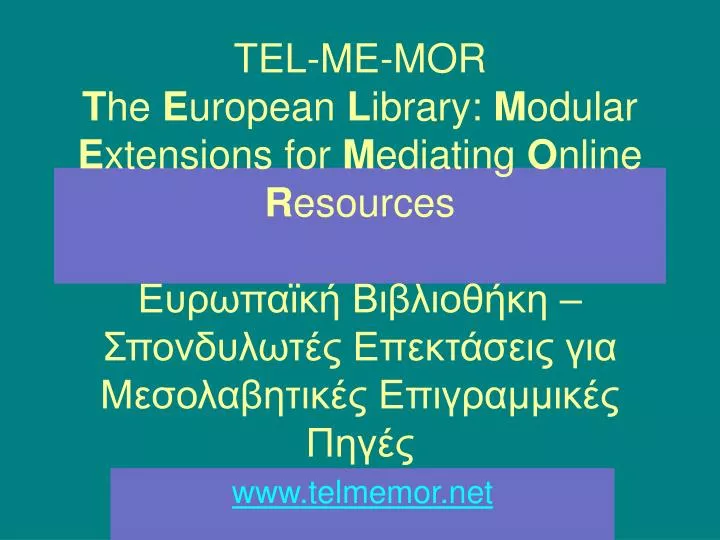 TEL-ME-MORThe European Library: Modular Extensions for Mediating Online ResourcesΕυρωπαϊκή Βιβλιοθήκη – Σπονδυλωτές Επεκτάσεις για Μεσολαβητικές Επιγραμμικές Πηγές www.telmemor.net