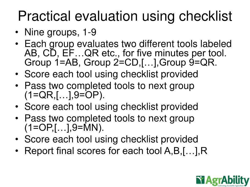 Practical evaluation using checklist • Nine groups, 1-9 • Each group evaluates two different tools labeled AB, CD, EF…QR etc., for five minutes per tool. Group 1=AB, Group 2=CD,[…],Group 9=QR. • Score each tool using checklist provided • Pass two completed tools to next group (1=QR,[…],9=OP). • Score each tool using checklist provided • Pass two completed tools to next group (1=OP,[…],9=MN). • Score each tool using checklist provided • Report final scores for each tool A,B,[…],R