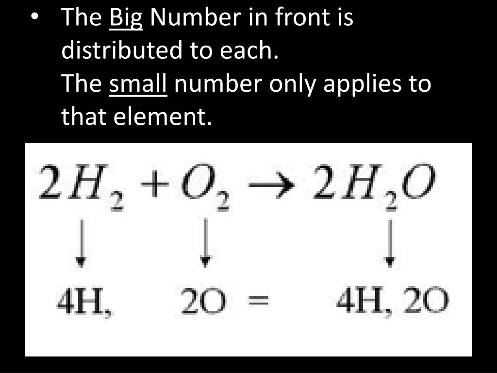 The Big Number in front is distributed to each. The small number only applies to that element.