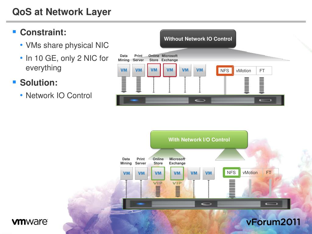 QoS at Network Layer • Constraint: • VMs share physical NIC • In 10 GE, only 2 NIC for everything • Solution: • Network IO Control Without Network IO Control Data Mining Print Server Online Store Microsoft Exchange NFS vMotion FT With Network I/O Control Data Mining Print Server Online Store Microsoft Exchange NFS vMotion FT