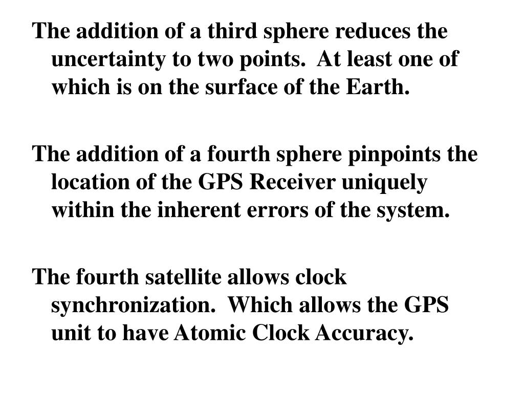The addition of a third sphere reduces the uncertainty to two points. At least one of which is on the surface of the Earth. The addition of a fourth sphere pinpoints the location of the GPS Receiver uniquely within the inherent errors of the system. The fourth satellite allows clock synchronization. Which allows the GPS unit to have Atomic Clock Accuracy.