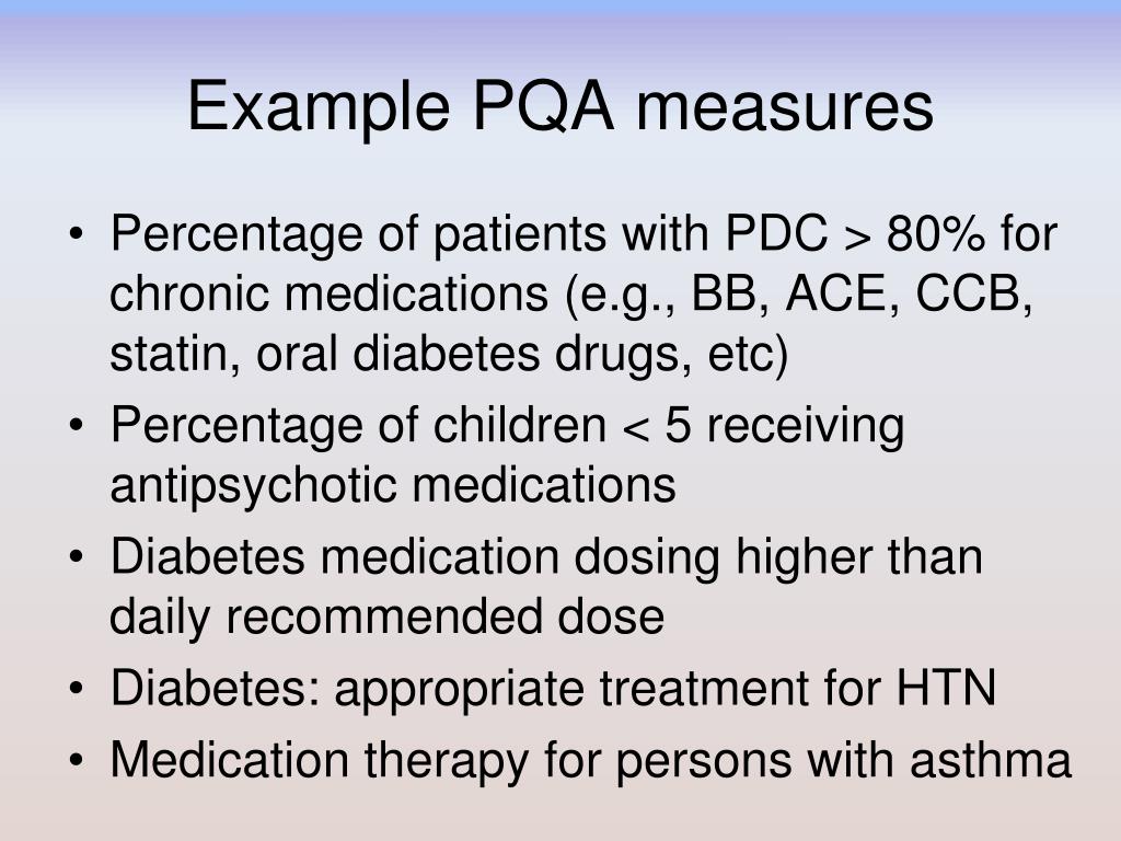 Example PQA measures • Percentage of patients with PDC > 80% for chronic medications (e.g., BB, ACE, CCB, statin, oral diabetes drugs, etc) • Percentage of children < 5 receiving antipsychotic medications • Diabetes medication dosing higher than daily recommended dose • Diabetes: appropriate treatment for HTN • Medication therapy for persons with asthma