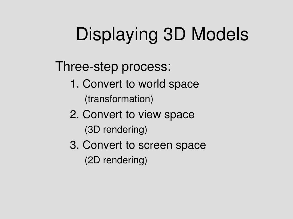 Displaying 3D Models • Three-step process: 1. Convert to world space (transformation) 2. Convert to view space (3D rendering) 3. Convert to screen space (2D rendering)