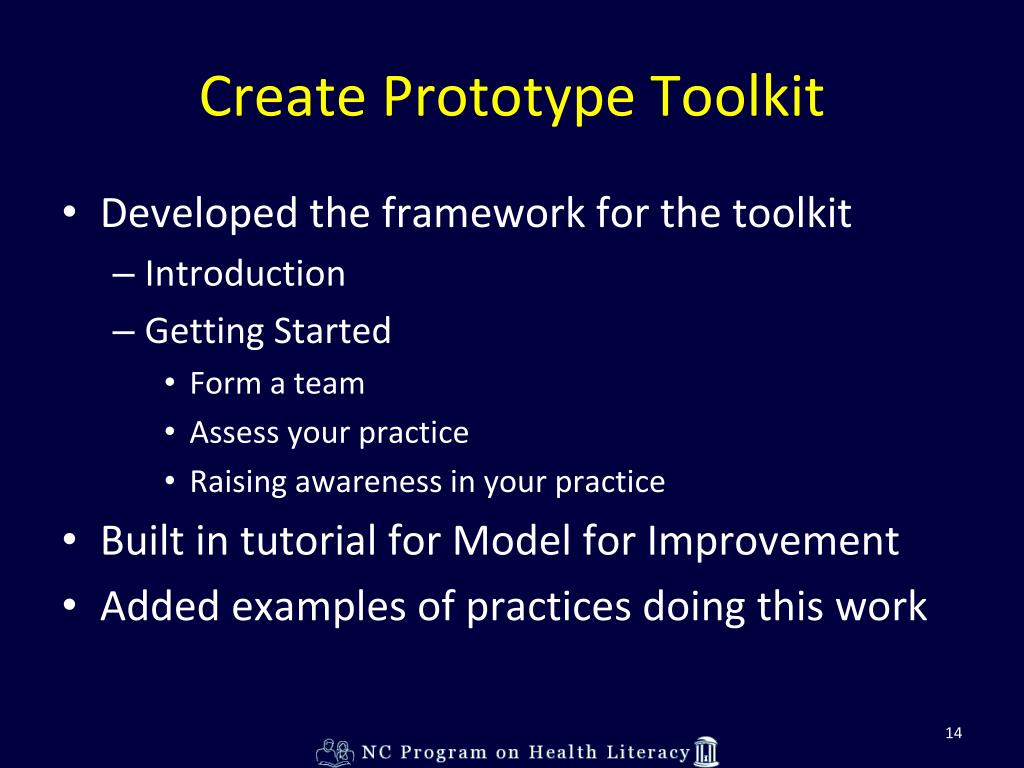 Create Prototype Toolkit • Developed the framework for the toolkit • Introduction • Getting Started • Form a team • Assess your practice • Raising awareness in your practice • Built in tutorial for Model for Improvement • Added examples of practices doing this work