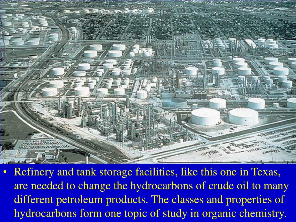 Refinery and tank storage facilities, like this one in Texas, are needed to change the hydrocarbons of crude oil to many different petroleum products. The classes and properties of hydrocarbons form one topic of study in organic chemistry.