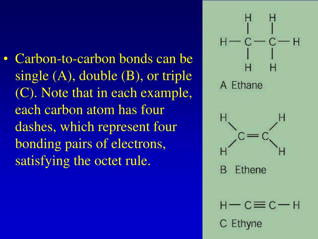 Carbon-to-carbon bonds can be single (A), double (B), or triple (C). Note that in each example, each carbon atom has four dashes, which represent four bonding pairs of electrons, satisfying the octet rule.