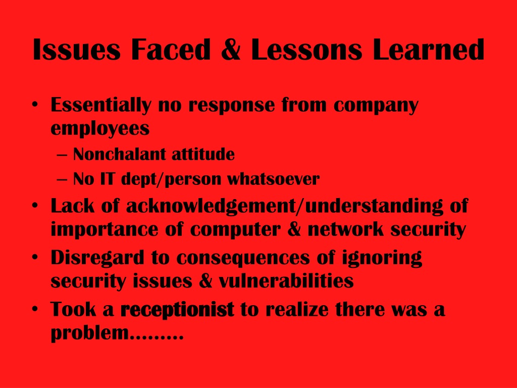Issues Faced & Lessons Learned • Essentially no response from company employees • Nonchalant attitude • No IT dept/person whatsoever • Lack of acknowledgement/understanding of importance of computer & network security • Disregard to consequences of ignoring security issues & vulnerabilities • Took a receptionist to realize there was a problem………