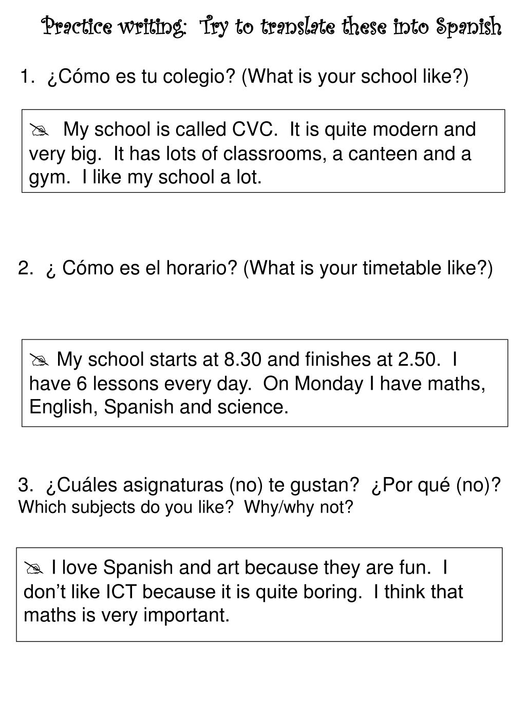 Practice writing: Try to translate these into Spanish 1. ¿Cómo es tu colegio? (What is your school like?) My school is called CVC. It is quite modern and very big. It has lots of classrooms, a canteen and a gym. I like my school a lot. 2. ¿ Cómo es el horario? (What is your timetable like?) My school starts at 8.30 and finishes at 2.50. I have 6 lessons every day. On Monday I have maths, English, Spanish and science. 3. ¿Cuáles asignaturas (no) te gustan? ¿Por qué (no)?Which subjects do you like? Why/why not? I love Spanish and art because they are fun. I don’t like ICT because it is quite boring. I think that maths is very important.