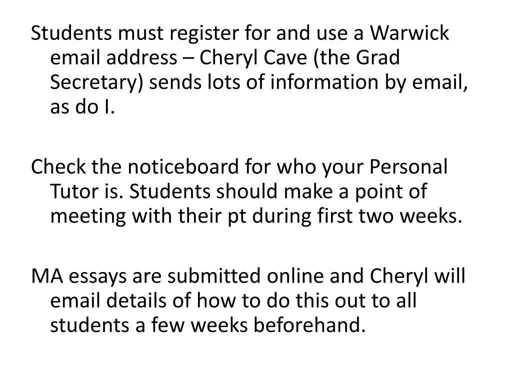 Students must register for and use a Warwick email address – Cheryl Cave (the Grad Secretary) sends lots of information by email, as do I. Check the noticeboard for who your Personal Tutor is. Students should make a point of meeting with their pt during first two weeks. MA essays are submitted online and Cheryl will email details of how to do this out to all students a few weeks beforehand.