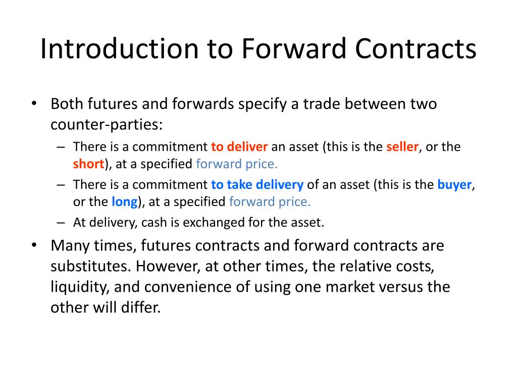 Introduction to Forward Contracts • Both futures and forwards specify a trade between two counter-parties: • There is a commitment to deliver an asset (this is the seller, or the short), at a specified forward price. • There is a commitment to take delivery of an asset (this is the buyer, or the long), at a specified forward price. • At delivery, cash is exchanged for the asset. • Many times, futures contracts and forward contracts are substitutes. However, at other times, the relative costs, liquidity, and convenience of using one market versus the other will differ.