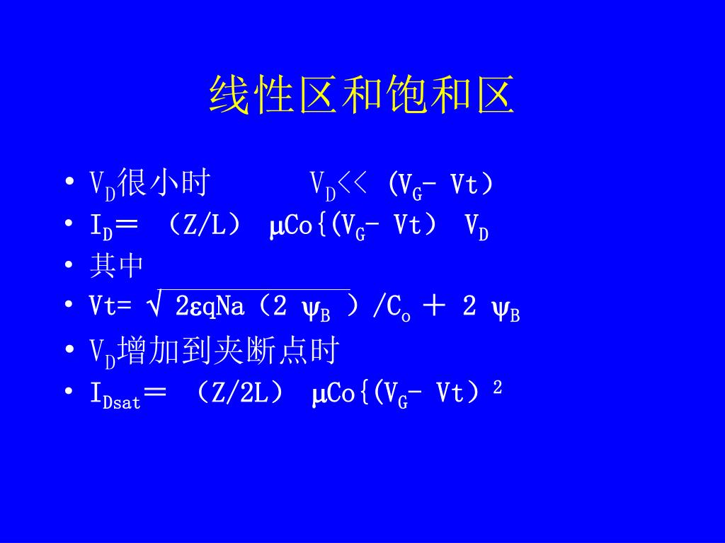 线性区和饱和区 • VD很小时 VD<< (VG- Vt) • ID= (Z/L) Co{(VG- Vt) VD • 其中 • Vt= 2qNa(2 B)/Co + 2 B • VD增加到夹断点时 • IDsat= (Z/2L) Co{(VG- Vt)2