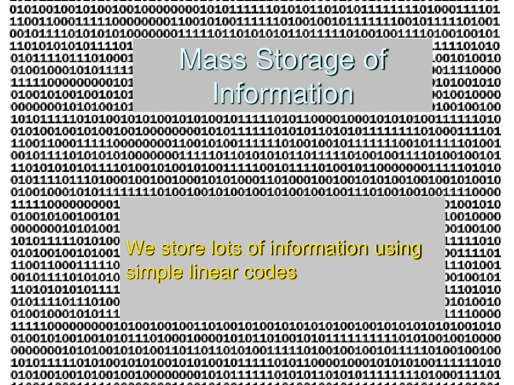 CTGGGTTCTGTTCGGGATCCCAGTCACAGGGACAATGGCGCATTCATATGTCACTTCCTTTACCTGCCTGGAGGAGGTGTGGCCACAGACTCTGGTGGCTGCGAACGGGGACTCTGACCCAGTCGACTTTATCGCCTTGACGAAGGGTTGGTTAATCCGTGCATGTGAGCTCCTCAGGGTGGAATCCAGGAGGATCCACGAGGGTGAATTGGCGGCATTCTTGTCTTACGCCATCGCCTACCCCCAAAACTTCCTGTCTGTGATTGACAGCTACAGCGTAGGATGCGGTCTGTTGAACTTCTGCGCGGTGGCTCTGGCTCTCTGTGAACTGGGCTACAGGCCTGTGGGGGTGCGTTTGGACAGCGGTGACCTCTGCAGCCTGTCGGTGGATGTCCGCCAGGTCTTCAGACGCTGCAGCGAGCATTTCTCCGTCCCTGCCTTTGATTCGTTGATCATCGTCGGGACGAATAACATCTCAGAGAAAAGCTTGACGGAGCTCAGCCTGAAGGAGAACCAGATTGACGTTGTCGGAGTCGGAACTCACCTGGTCACCTGTACGACTCAGCCGTCGCTGGGTTGCGTTTACAAGCTGGTGGAGGTGAGGGGGAGGCCCCGGATGAAGATCAGCGAGGATCCGGAAAAGAGCACCGTTCCCGGGAGGAAGCAGGTGTACCGCCTGATGGACACTGATGCTCCTCCAGAACCTGGAGTCCCTCTGAGCTGCTTCCCTCTGTGCTCCGATCGCTCCTCCGTCTCCGTCACCCCGGCGCAGGTTCACCGTCTGCGGCAGGAAGTCTTTGTTGATGGACAGGTCACAGCCCGTCTGTGCAGCGCCACAGAGACCAGAACGGAGGTCCAGACCGCTCTCAAGACCCTCCACCCTCGACACCAGAGGCTGCAGGAGCCAGACTCGTACACGGTGATTCACATTCTGAAGAAAACAACATTGGATCGCGCTTTTCCGCTCTCTTCCCTTAGTTTCCCCTCCGAACTCCGCCGCTGGGCCGGAGGACTGAACCGGCCCCCGACGGTGTCCCAGCGGCGGTGCAATGTGGCCCGGGTCCGGGAGGAGTGCGTGACGCCAGAGCAGAATGGTTCGGTGGACGGGGGCGCACACGCTTCTCGCCGCGGCCGCTCCCCGCGGCCCACGGAACCGCGGGATCGGAGCTGTTTTGTGCCGCCTGAAGGACTCGAAGGGGGACGGATAAATGCTGGATCCCCGAGTCCAGATCTGACCGTCTGCATTCCGCTGGTGAGCTGCCAGACGCATCTGGAAACGAGCGCCGACAGAAGCAGCTCCGGACCATGTCGCCGTCCGCGCACACAGGTCGCGTGTAAAGGGGACTTGGTCAGATCATCTTGCACCGGAACCAGGTCTCCCCTGGAGATGGGGACGGTCATGACCGTCTTCTACCAGAAGAAGTCCCAGCGGCCGGAGAGGAGAACCTTCCAGATCAAGCCTGACACGCGGCTCCTCGTGTGGAGCCGAAACCCCGACAAAAGCGAAGGAGAGAGTGAGTATGAGCAGGCGGGCCGTGCCGGGACCGGGCCCACGCCGCCCAGAACCTCATGTTCCTGGTGTTCCAGCACCGACCGGCCAGTTCTGGCTCAGCTCCACACAACATCTGACAAACCCTCGTGGTTCCTGGTGGTCGACCACACGGCTGGTGAGGCGGCCTCAGGTAGCTCAGGTAGCTCAGGTTAGCGTAAAGGGAGTTTTAAGCATCACCTGGTGACGGGGCAGGTGAGCTCCAGCCACTCAGCAGTGCACGGCCGTGCACATACACACACACCTCTGTGTCGAGGTTACAGGTGGGGCCAAAGCCCAACACCTTCAATGGCCCTCAGAGCTTTGAGGTTTTGAGGAATTGAGCCTTTAATCAGAAAACTGGGTTCTGTTCGGGATCCCAGTCACAGGGACAATGGCGCATTCATATGTCACTTCCTTTACCTGCCTGGAGGAGGTGTGGCCACAGACTCTGGTGGCTGCGAACGGGGACTCTGACCCAGTCGACTTTATCGCCTTGACGAAGGGTTGGTTAATCCGTGCATGTGAGCTCCTCAGGGTGGAATCCAGGAGGATCCACGAGGGTGAATTGGCGGCATTCTTGTCTTACGCCATCGCCTACCCCCAAAACTTCCTGTCTGTGATTGACAGCTACAGCGTAGGATGCGGTCTGTTGAACTTCTGCGCGGTGGCTCTGGCTCTCTGTGAACTGGGCTACAGGCCTGTGGGGGTGCGTTTGGACAGCGGTGACCTCTGCAGCCTGTCGGTGGATGTCCGCCAGGTCTTCAGACGCTGCAGCGAGCATTTCTCCGTCCCTGCCTTTGATTCGTTGATCATCGTCGGGACGAATAACATCTCAGAGAAAAGCTTGACGGAGCTCAGCCTGAAGGAGAACCAGATTGACGTTGTCGGAGTCGGAACTCACCTGGTCACCTGTACGACTCAGCCGTCGCTGGGTTGCGTTTACAAGCTGGTGGAGGTGAGGGGGAGGCCCCGGATGAAGATCAGCGAGGATCCGGAAAAGAGCACCGTTCCCGGGAGGAAGCAGGTGTACCGCCTGATGGACACTGATGCTCCTCCAGAACCTGGAGTCCCTCTGAGCTGCTTCCCTCTGTGCTCCGATCGCTCCTCCGTCTCCGTCACCCCGGCGCAGGTTCACCGTCTGCGGCAGGAAGTCTTTGTTGATGGACAGGTCACAGCCCGTCTGTGCAGCGCCACAGAGACCAGAACGGAGGTCCAGACCGCTCTCAAGACCCTCCACCCTCGACACCAGAGGCTGCAGGAGCCAGACTCGTACACGGTGATTCACATTCTGAAGAAAACAACATTGGATCGCGCTTTTCCGCTCTCTTCCCTTAGTTTCCCCTCCGAACTCCGCCGCTGGGCCGGAGGACTGAACCGGCCCCCGACGGTGTCCCAGCGGCGGTGCAATGTGGCCCGGGTCCGGGAGGAGTGCGTGACGCCAGAGCAGAATGGTTCGGTGGACGGGGGCGCACACGCTTCTCGCCGCGGCCGCTCCCCGCGGCCCACGGAACCGCGGGATCGGAGCTGTTTTGTGCCGCCTGAAGGACTCGAAGGGGGACGGATAAATGCTGGATCCCCGAGTCCAGATCTGACCGTCTGCATTCCGCTGGTGAGCTGCCAGACGCATCTGGAAACGAGCGCCGACAGAAGCAGCTCCGGACCATGTCGCCGTCCGCGCACACAGGTCGCGTGTAAAGGGGACTTGGTCAGATCATCTTGCACCGGAACCAGGTCTCCCCTGGAGATGGGGACGGTCATGACCGTCTTCTACCAGAAGAAGTCCCAGCGGCCGGAGAGGAGAACCTTCCAGATCAAGCCTGACACGCGGCTCCTCGTGTGGAGCCGAAACCCCGACAAAAGCGAAGGAGAGAGTGAGTATGAGCAGGCGGGCCGTGCCGGGACCGGGCCCACGCCGCCCAGAACCTCATGTTCCTGGTGTTCCAGCACCGACCGGCCAGTTCTGGCTCAGCTCCACACAACATCTGACAAACCCTCGTGGTTCCTGGTGGTCGACCACACGGCTGGTGAGGCGGCCTCAGGTAGCTCAGGTAGCTCAGGTTAGCGTAAAGGGAGTTTTAAGCATCACCTGGTGACGGGGCAGGTGAGCTCCAGCCACTCAGCAGTGCACGGCCGTGCACATACACACACACCTCTGTGTCGAGGTTACAGGTGGGGCCAAAGCCCAACACCTTCAATGGCCCTCAGAGCTTTGAGGTTTTGAGGAATTGAGCCTTTAATCAGAAAA Mass Storage of Information Another simple linear code, the DNA sequence, is the basis of life