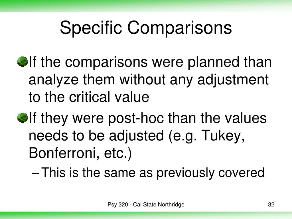 Specific Comparisons • If the comparisons were planned than analyze them without any adjustment to the critical value • If they were post-hoc than the values needs to be adjusted (e.g. Tukey, Bonferroni, etc.) • This is the same as previously covered Psy 320 - Cal State Northridge